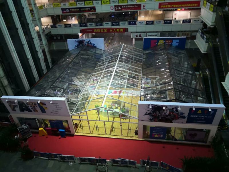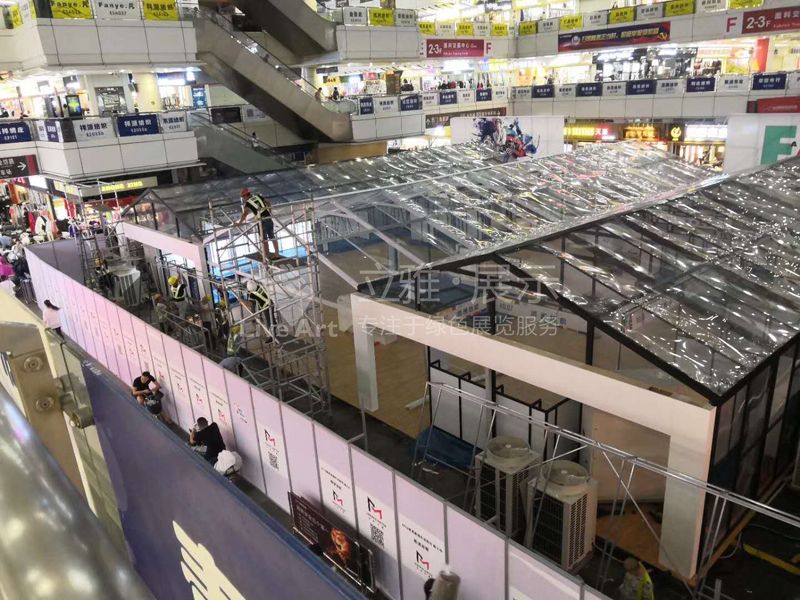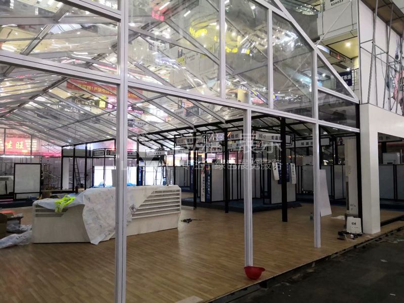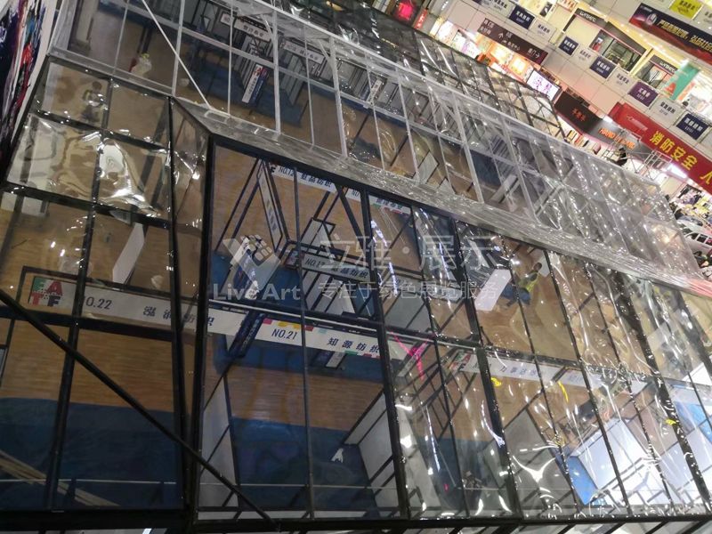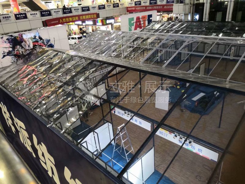 上屆面輔料采購節(jié)整體結(jié)構(gòu)采用金屬結(jié)構(gòu)氟碳噴涂,配合頂部透明亞克力頂棚,營造一個獨立、密封、但又通透的展示空間,所有畫面采用綠色環(huán)保、高清、無氣味的熱轉(zhuǎn)印噴繪布。