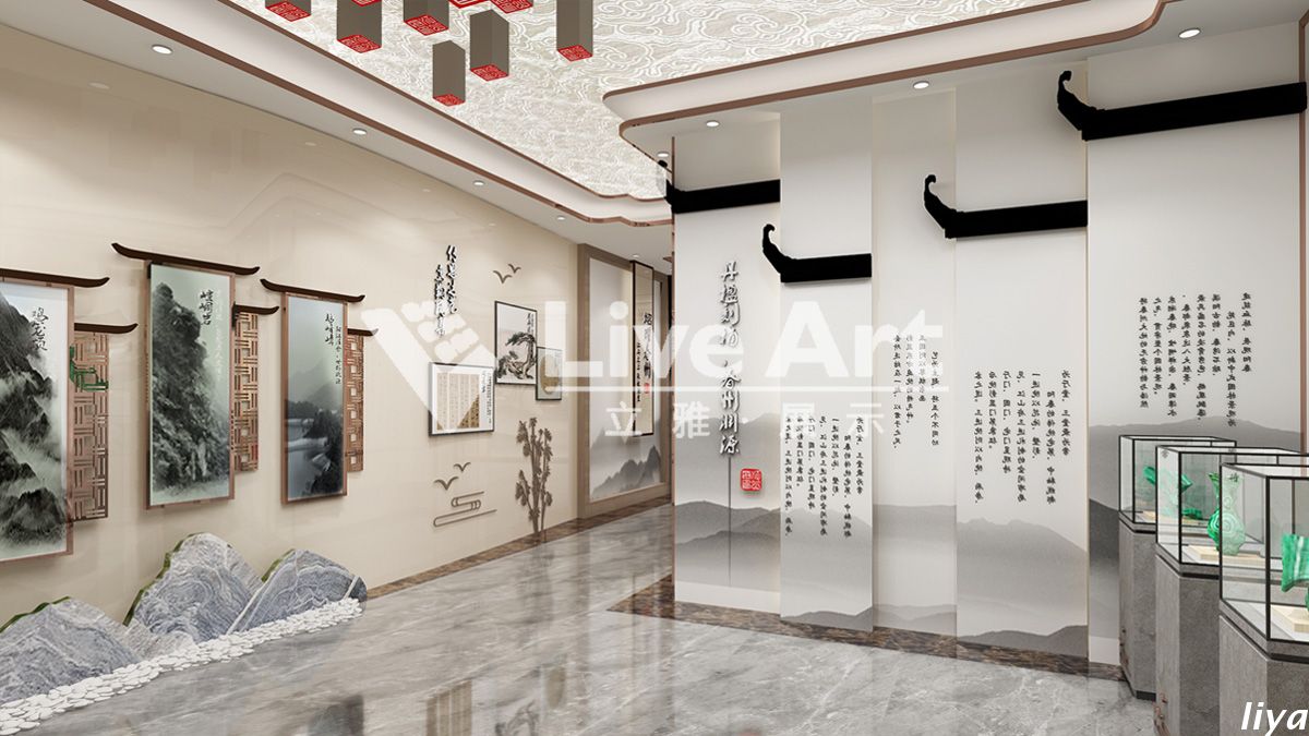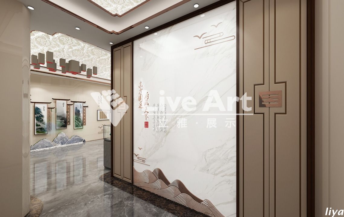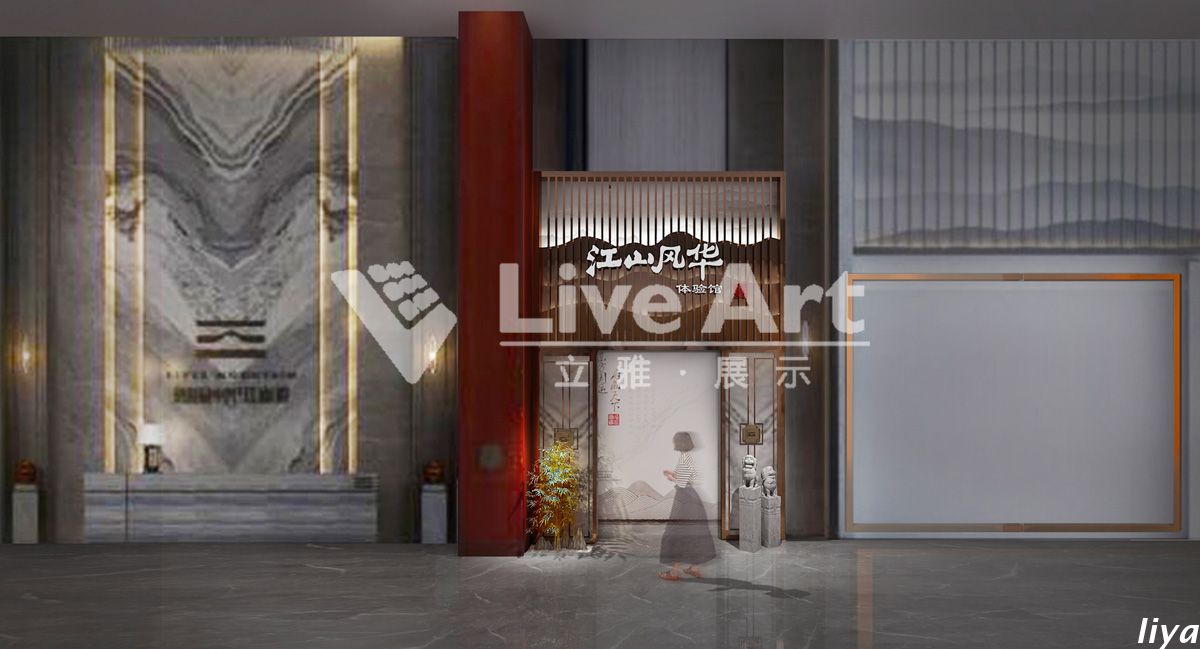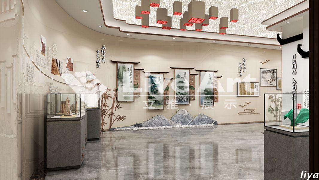 以根雕雅石,山水古韻中提取流線型的曲線元素貫穿,輔以代表山水的枯山水,營造具有強(qiáng)烈韻律感的展示空間。