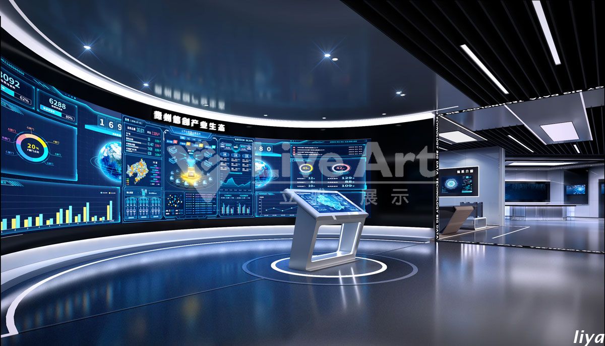 信創(chuàng)產(chǎn)業(yè)區(qū):通過信創(chuàng)之路及信創(chuàng)生態(tài)進(jìn)行介紹。 該空間中,通過弧形LED屏呈現(xiàn)信創(chuàng)產(chǎn)業(yè)領(lǐng)軍企業(yè)及宏大布局圖,參觀者可通過操控觸控操作臺(tái),點(diǎn)選切換LED屏的展示內(nèi)容了解相關(guān)具體信息。