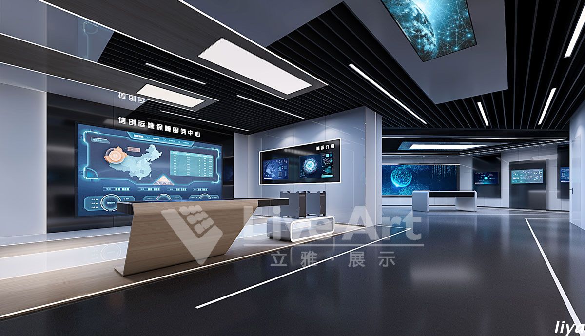 信創(chuàng)運(yùn)維保障服務(wù)中心 :大屏展示實(shí)時(shí)運(yùn)維數(shù)據(jù),直觀呈現(xiàn)中心工作信息作為信創(chuàng)運(yùn)維保障服務(wù)中心的介紹;體系介紹:通過屏幕介紹中心的組織架構(gòu)及服務(wù)模式,并在一旁展示相關(guān)的電話、臺(tái)式機(jī)實(shí)物,讓參觀者可以直接進(jìn)行操作體驗(yàn)。
