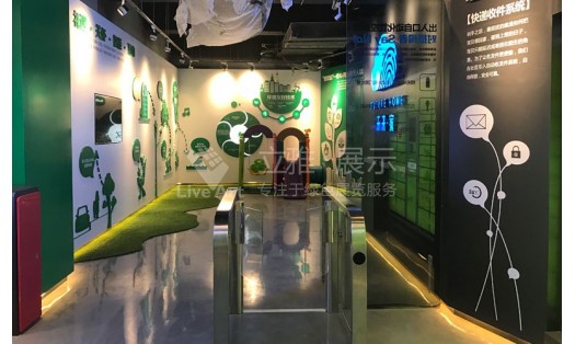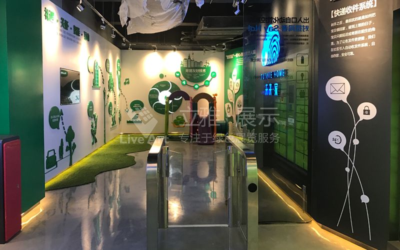 展廳設(shè)計(jì)制作特色3:綠地集團(tuán)將“理想家”的構(gòu)想實(shí)現(xiàn)在綠地璀璨天城之中,使理想轉(zhuǎn)變?yōu)轱@現(xiàn)實(shí),品牌字以立體發(fā)光字制作,“豐巢”綠色畫面全由UV軟膜燈箱卡型材。白色平面字體均為絲印字,安全家架構(gòu)則以玫瑰金鋁框架卡UV軟膜燈箱,家的內(nèi)部區(qū)域底部與地面接觸距離10mm設(shè)置線光燈帶,細(xì)節(jié)體現(xiàn)通過(guò)木結(jié)構(gòu)縮小板及櫥窗展示柜展示“家”的精致裝修。