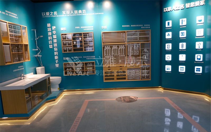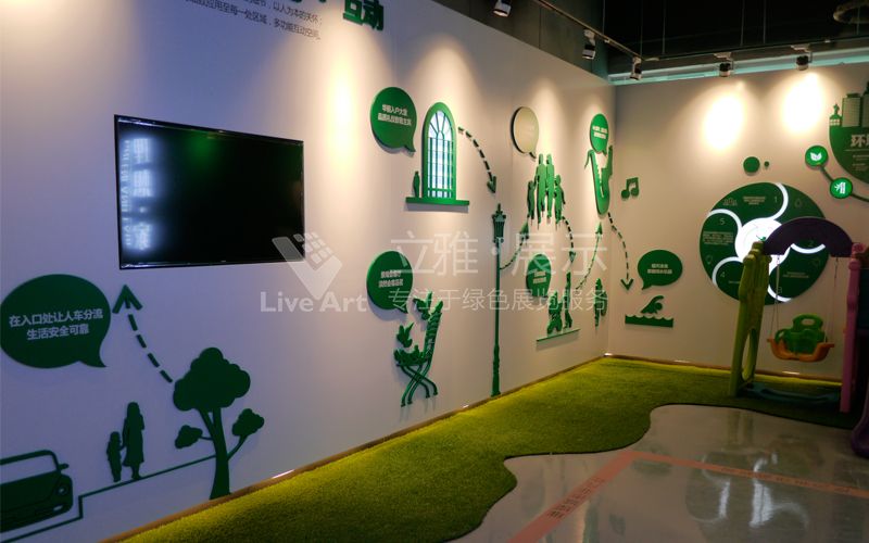 展廳設(shè)計(jì)制作特色2:理想家以亞克力發(fā)光字制作,而墻面則是以烤漆板加立體雕刻人、物形象展示安全家園。
