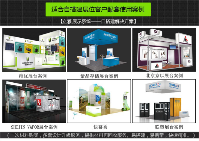 型材展臺自搭建專為出國展客戶量身定制,所有物料采用綠色環(huán)保鋁型材結(jié)構(gòu)與熱轉(zhuǎn)印布飾結(jié)合,方便外展客戶快速自搭建,安裝簡易無需專業(yè)人士指導(dǎo)。