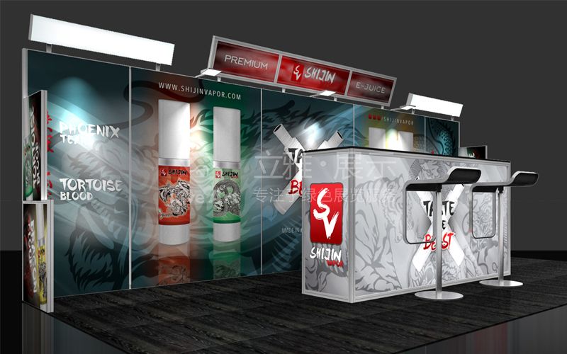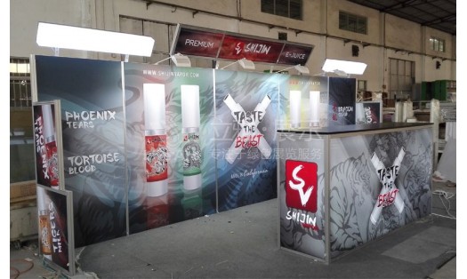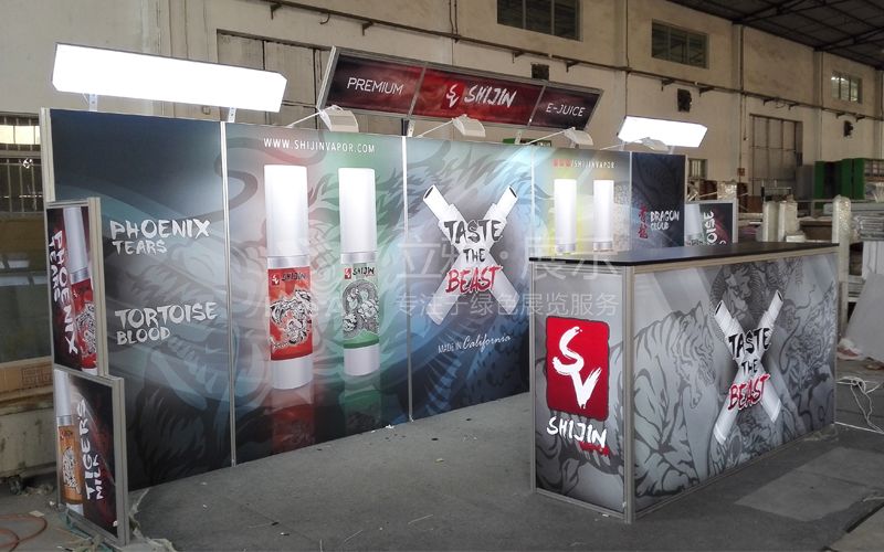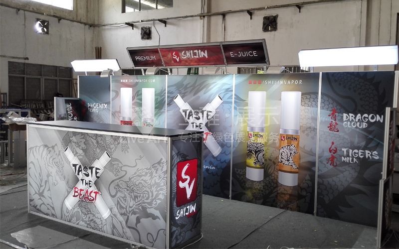 小結(jié):SHIJIN VAPOR展臺(tái)簡(jiǎn)潔大氣的風(fēng)格不乏燈光效果的影響,展臺(tái)LED燈管并非直接安裝在鋁型材上面,而是以制作小配件形式安裝在配件上面,加大LED的燈管與畫面距離使燈光效果好,并且更容易安裝及拆除。并前臺(tái)熱轉(zhuǎn)印卡布設(shè)置拉鏈儲(chǔ)物柜,充分利用前臺(tái)展臺(tái)空間,內(nèi)里分層,分別擺放重物及輕便物品。整個(gè)展臺(tái)充分考慮展示效果及空間的合理運(yùn)用。這便是立雅展示針對(duì)年度多展或出國(guó)展企業(yè)客戶提供的買斷材料服務(wù),買斷材料自搭建方案能夠最大程度的節(jié)約企業(yè)展臺(tái)制作成本,并可預(yù)算搭建時(shí)間及對(duì)展臺(tái)空間的熟悉程度及運(yùn)用。立雅展示,為展覽事業(yè)發(fā)展而不斷成長(zhǎng)的企業(yè),選擇立雅,成就完美展臺(tái)。
