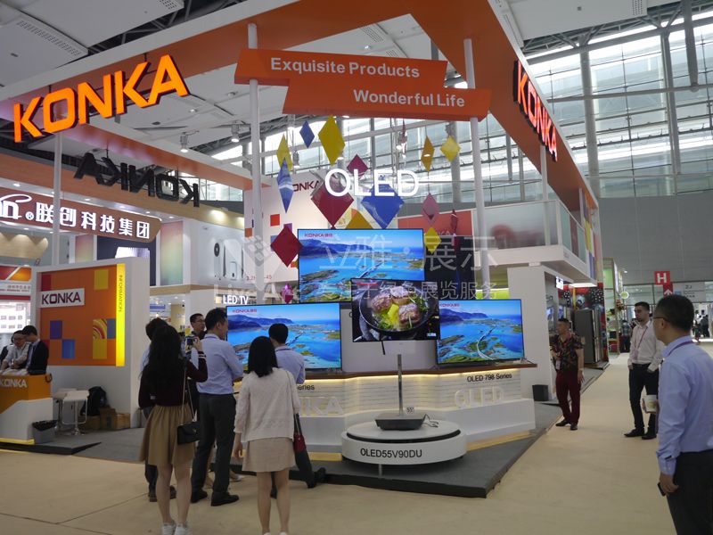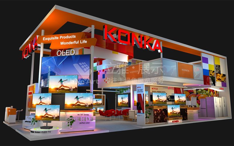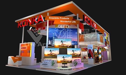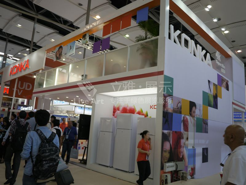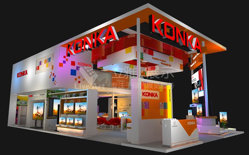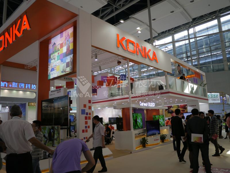 展臺搭建特色:康佳展位設(shè)置在3.2館主通道,面積約為160平方,以彩色電視機(jī)、手機(jī)、冰箱、洗衣機(jī)等為主要展覽產(chǎn)品,展臺以橙白兩色為主色調(diào),正面及兩側(cè)面品牌橙色發(fā)光字尤為亮眼,并設(shè)置展臺二層結(jié)構(gòu),兼顧展位設(shè)計美觀的同時給予舒適的展覽及洽談環(huán)境。